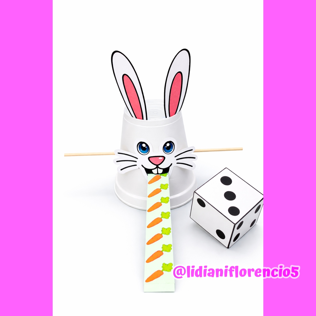 A criança joga o dado e alimenta o coelhinho puxando a quantidade correspondente de cenourinhas 🥕🐰