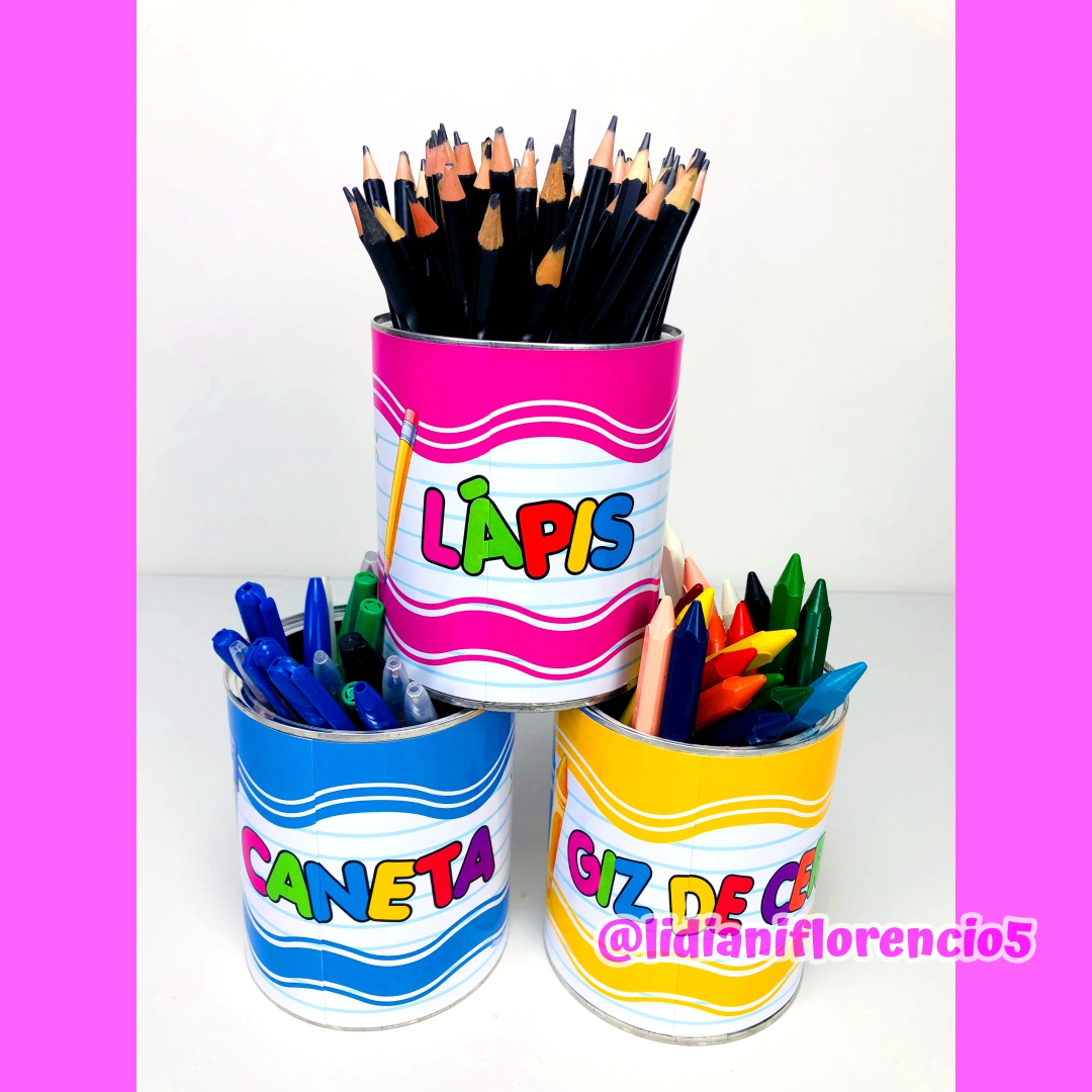 Transforme latas comuns em organizadores lindos para materiais da turma. Identidade visual unificada, rotina mais fluida e crianças mais autônomas!