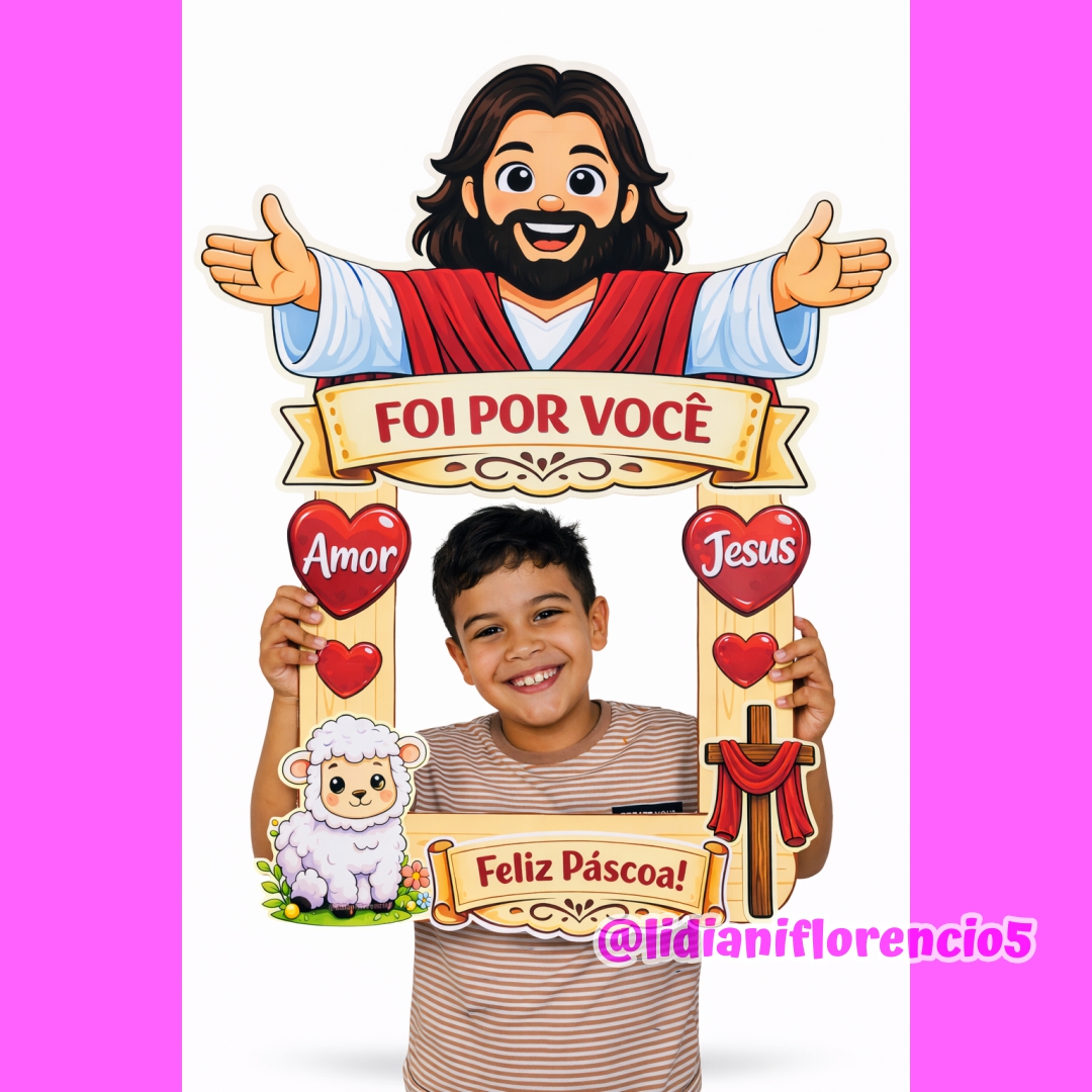 A Moldura Grande Páscoa Cristã é perfeita para fotos especiais, trabalhando com as crianças a verdadeira mensagem da Páscoa: amor, entrega e esperança. ✨