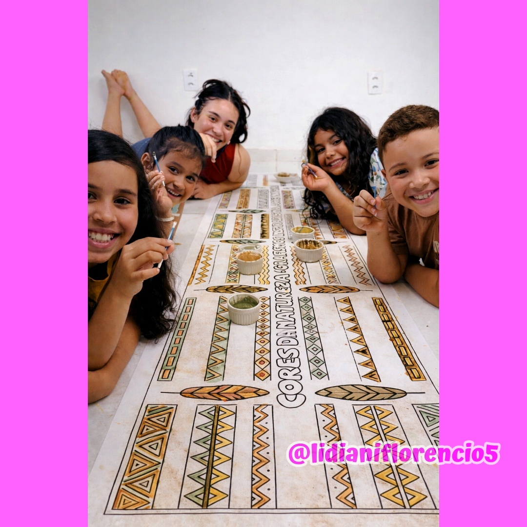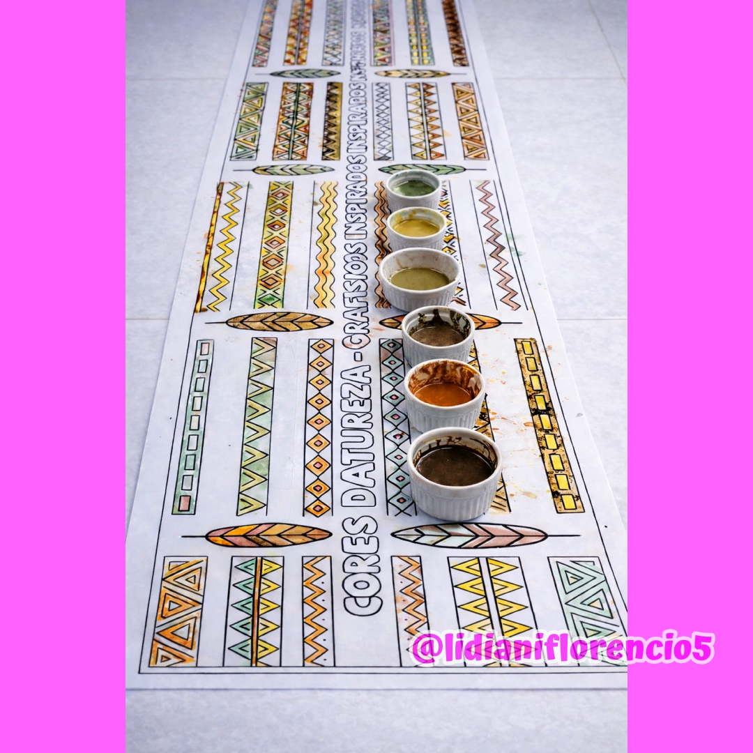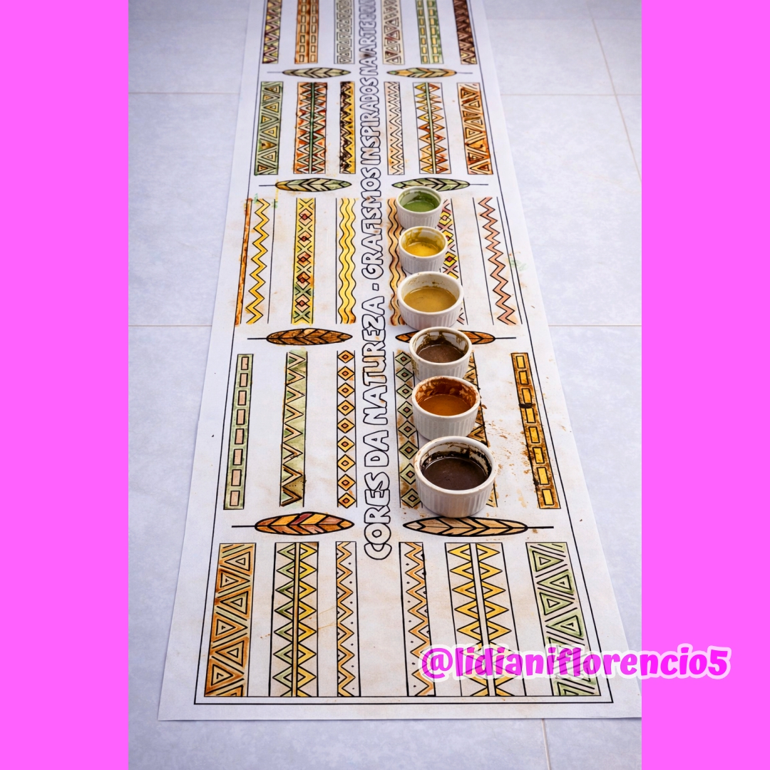 O Tapete Grafismo Indígena é uma atividade coletiva perfeita para a Educação Infantil! As crianças exploram formas, linhas e padrões inspirados nos grafismos, utilizando tinta caseira feita com elementos naturais 🌱🍠🌿